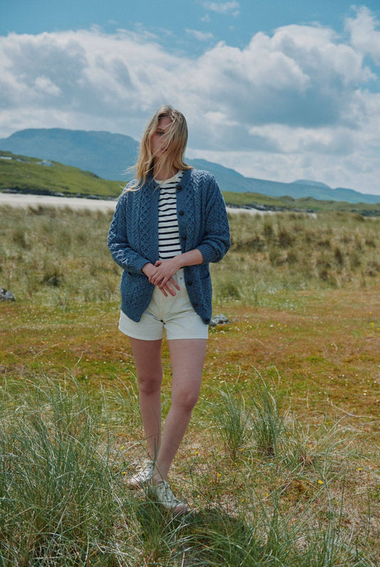 Achill Island Ladies Merino Aran Cardigan - Denim