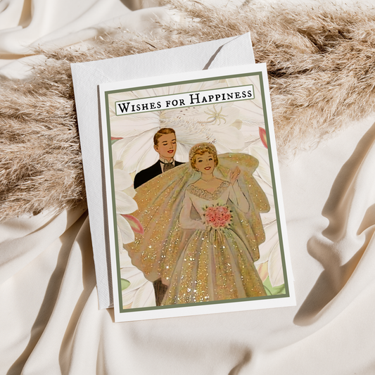 Wedding Card. Vintage Bride and Groom. Wishes for Happiness.