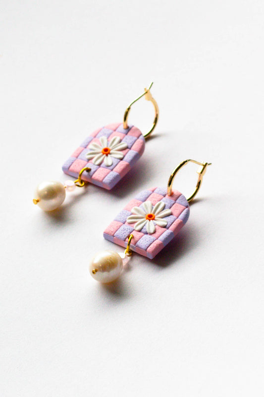 Flower Checkered Arch Gold Hoop Earrings Freshwater Pearl: Pastel Purple & Pink