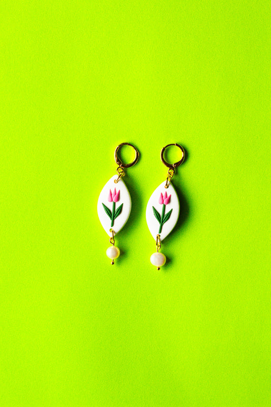 Tulip Huggie Hoop Dangle with Freshwater Pearl - White