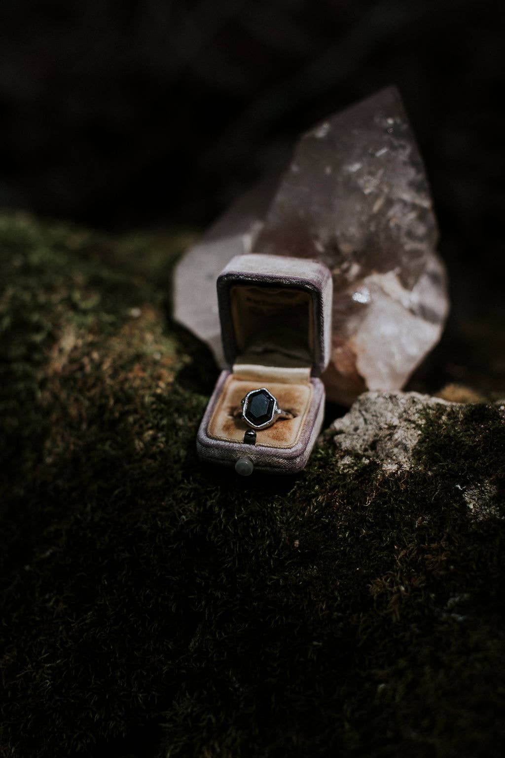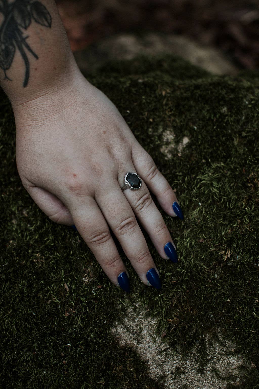 Polished Hematite Cabochon | Solid Sterling Silver Band Handmade in Canada | Queer-Owned | Witch-Approved Part of the Alchemy Rings Collection, this ring features a polished hematite cabochon set in a solid sterling silver band.
