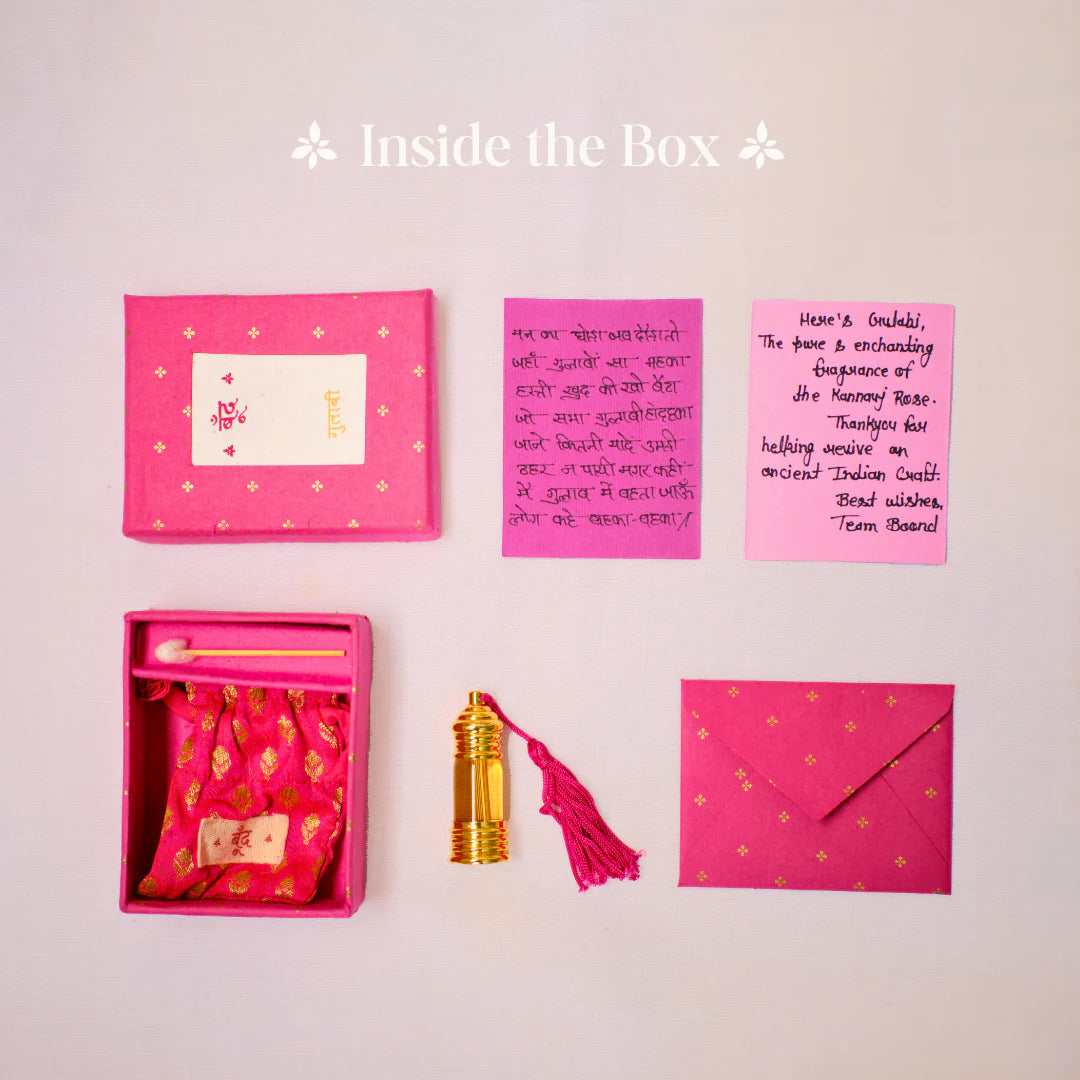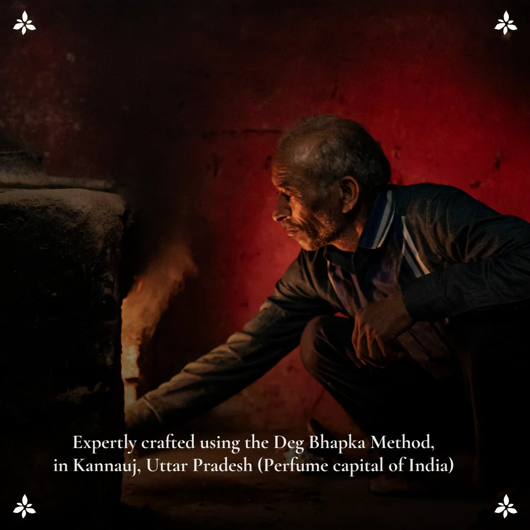 Gulab / Indian Rose - The enchanting fragrance of the Indian Rose evokes joy and love with its subtle floral and sweet notes. A completely natural fragrance that lingers delicately for 4–6 hours. Apply a few drops to your palms and dab gently for a timeless, soothing experience.