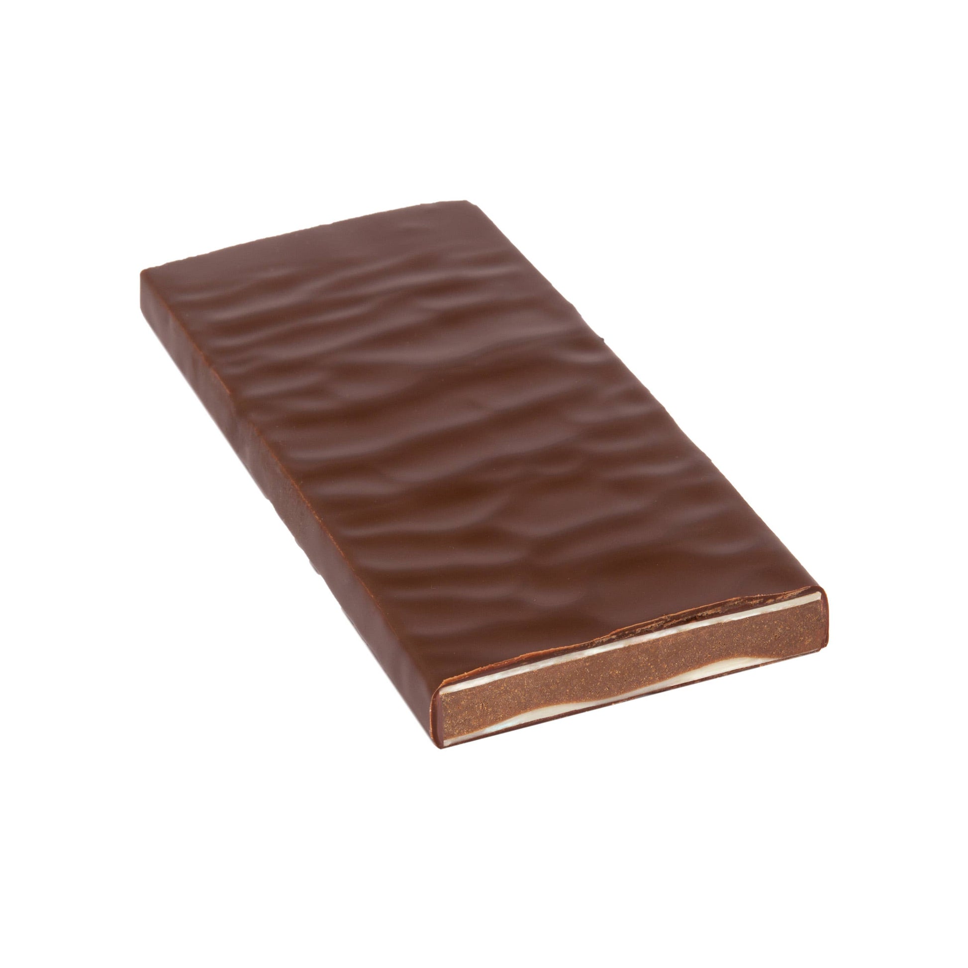 A creamy, gently sweet coffee ganache with an impactful coffee flavour, mixed with dark chocolate and a dash of milk. It’s coated with a wafer-thin layer of white chocolate and covered overall with a classic dark chocolate boasting 70% cacao power.