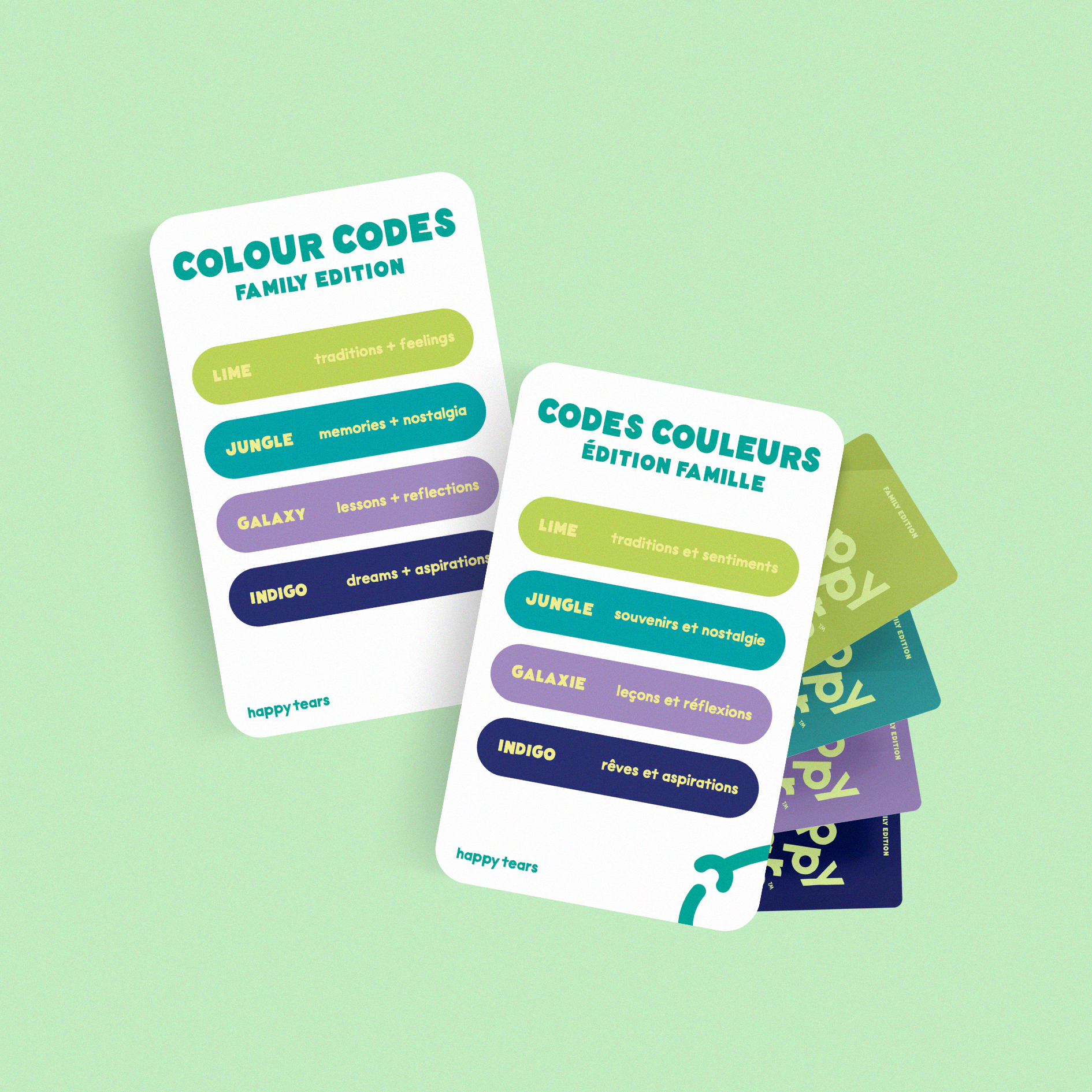 - 4 categories that dive into the heart of your family: - 25 lime cards: traditions + feelings - 25 jungle cards: memories + nostalgia - 25 galaxy cards: lessons + reflections - 25 indigo cards: dreams + aspirations 4 instruction cards for safe and intentional gameplay.