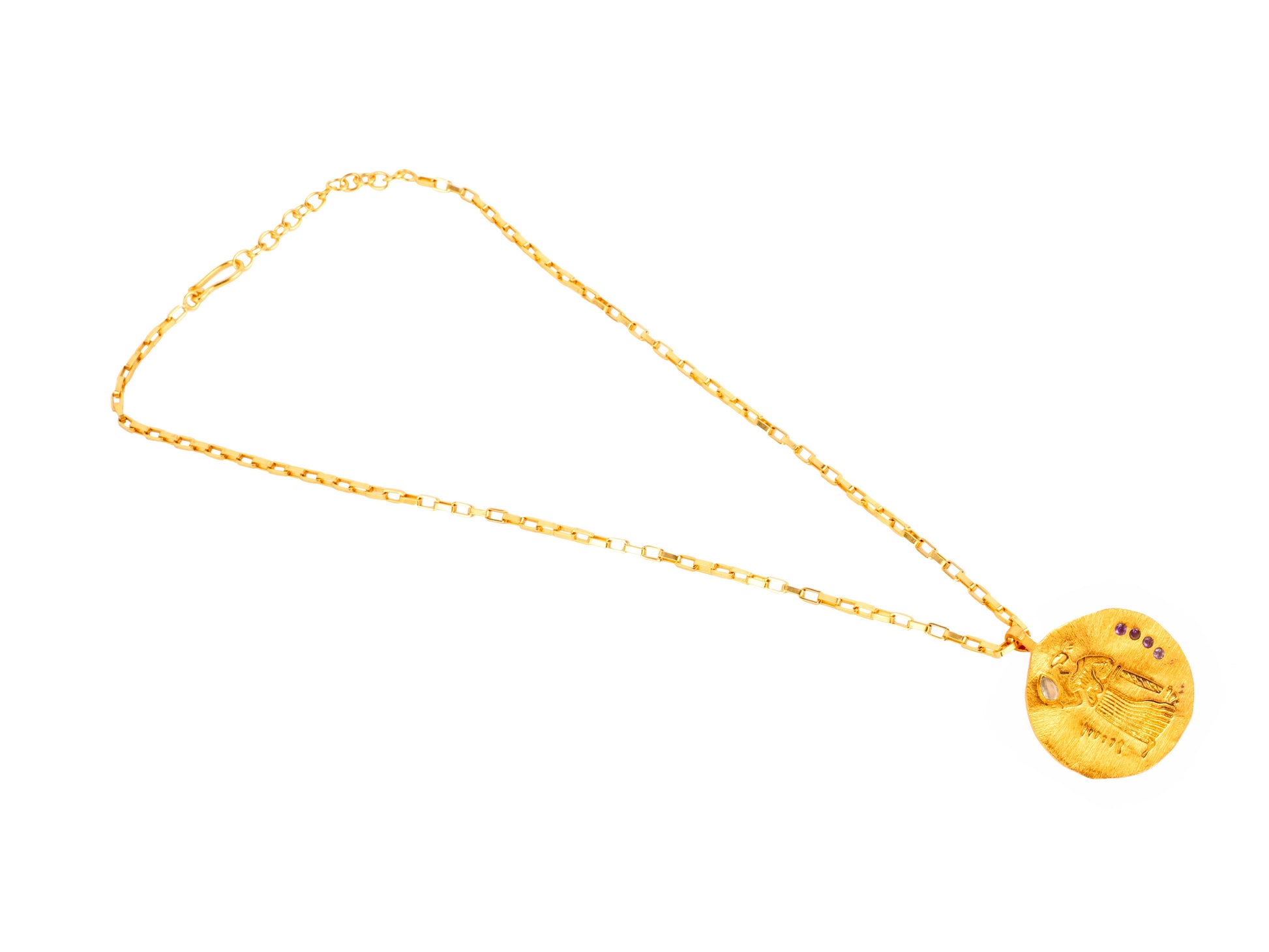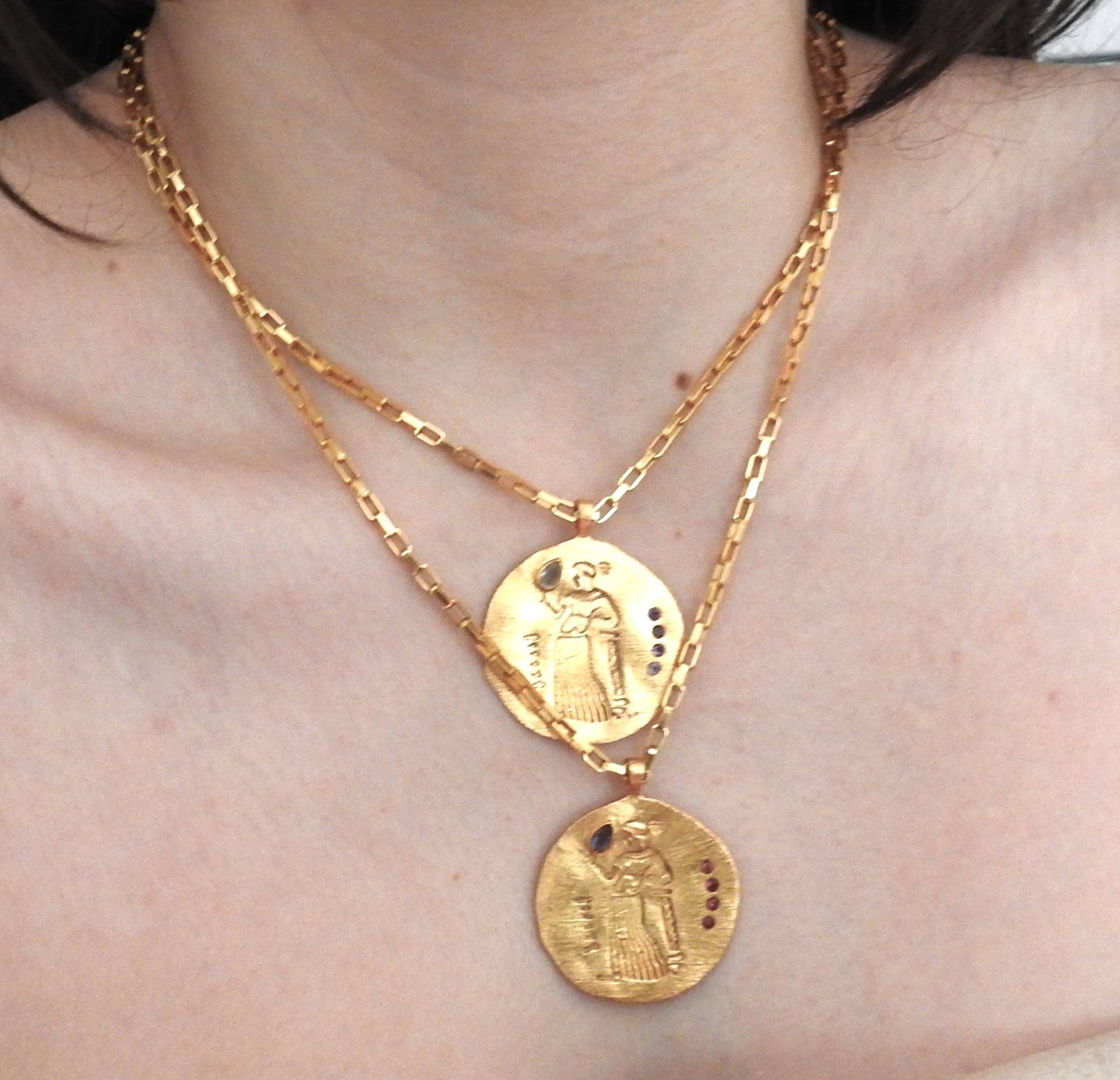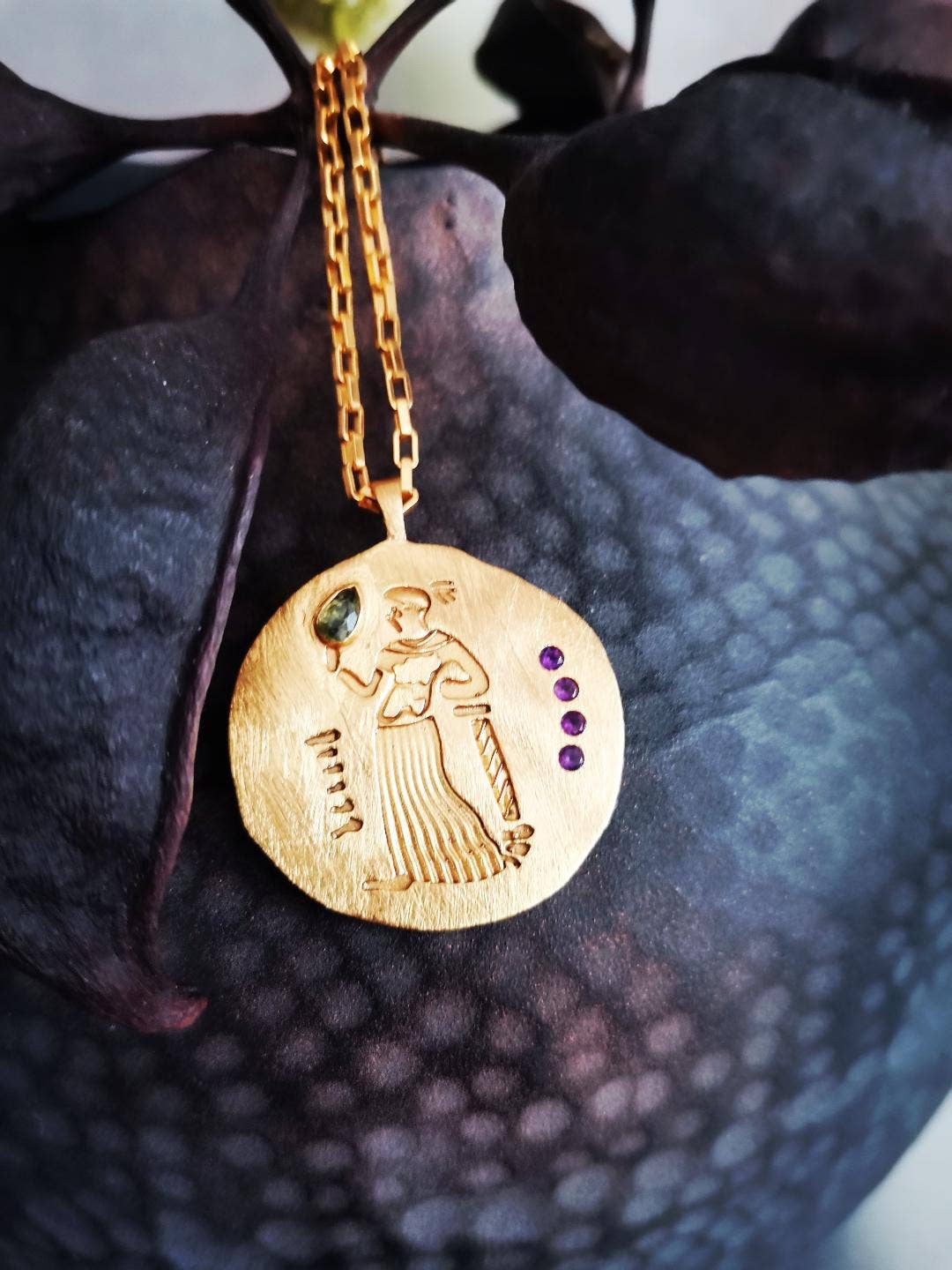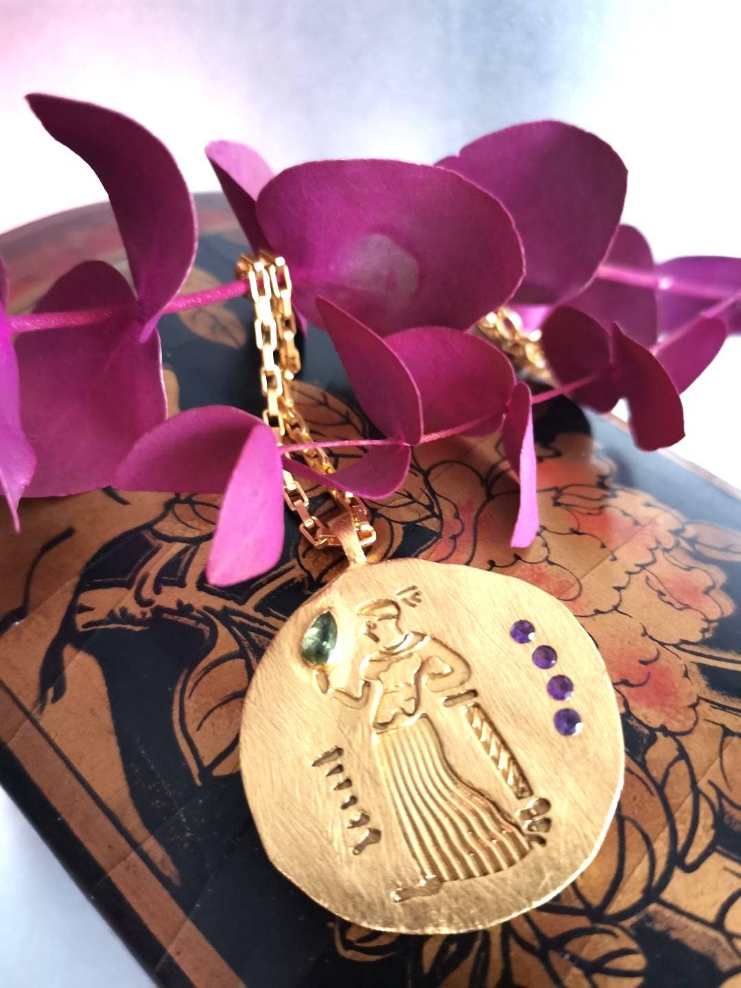 Original Greek-inspired necklace in the shape of a medallion with Prehnite and small amethysts