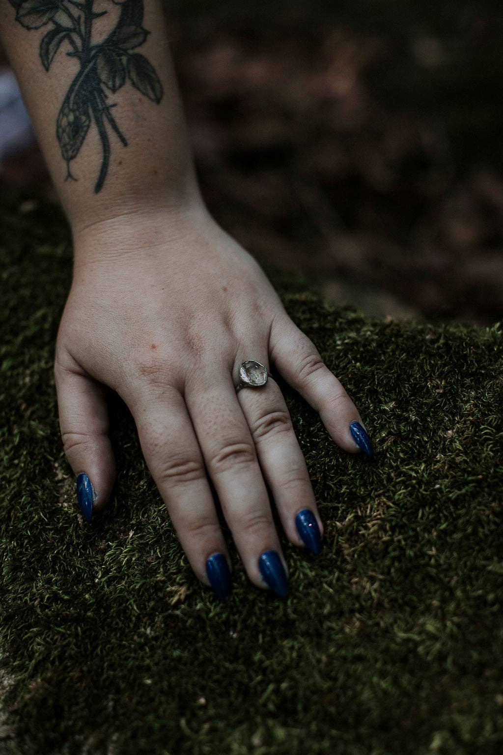 The Herkimer Diamond Pebble Ring features a raw, uncut Herkimer quartz crystal—a naturally double-terminated stone known for its powerful energy, clarity, and ability to amplify intentions.