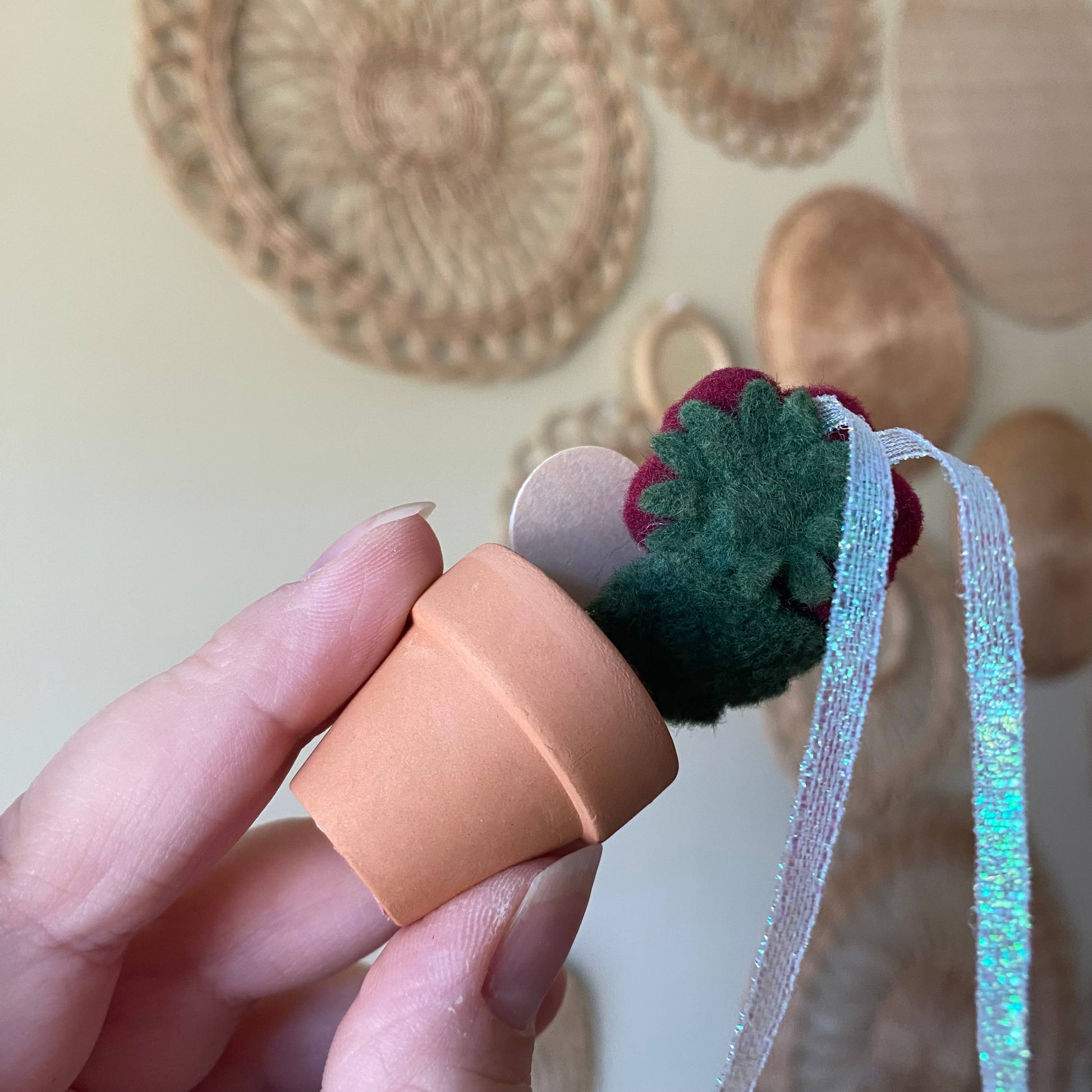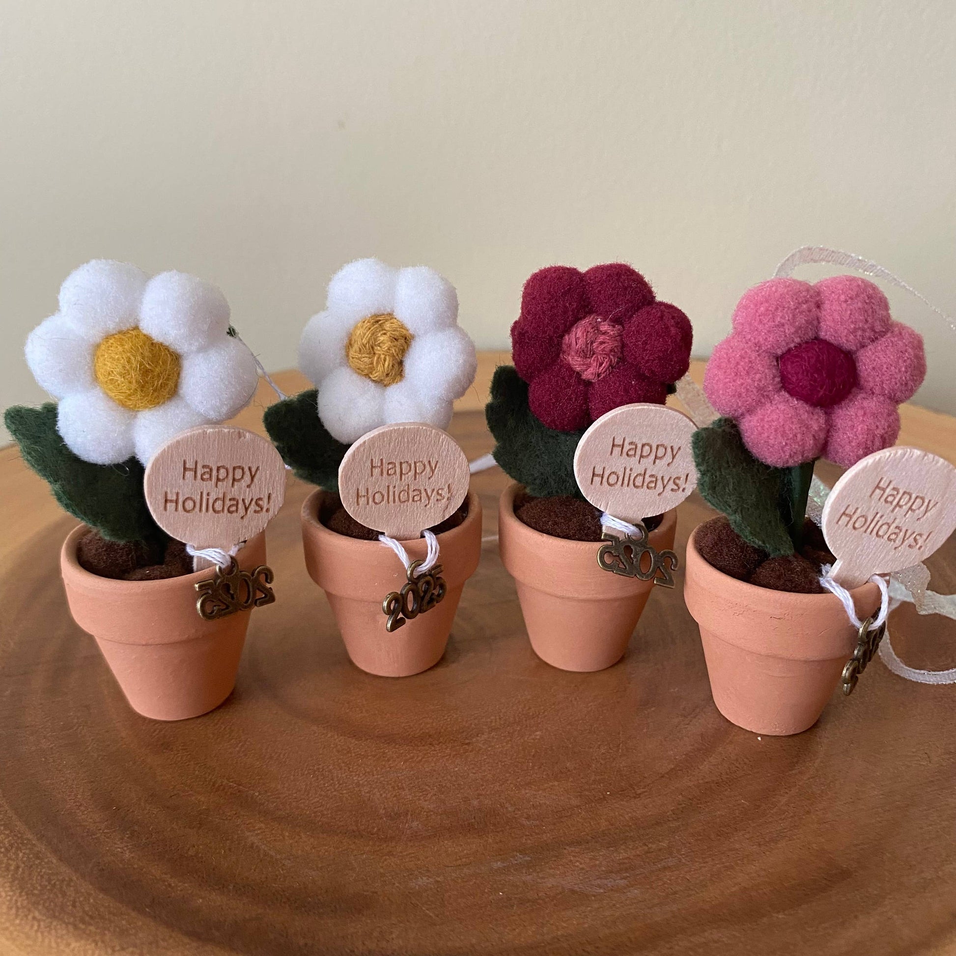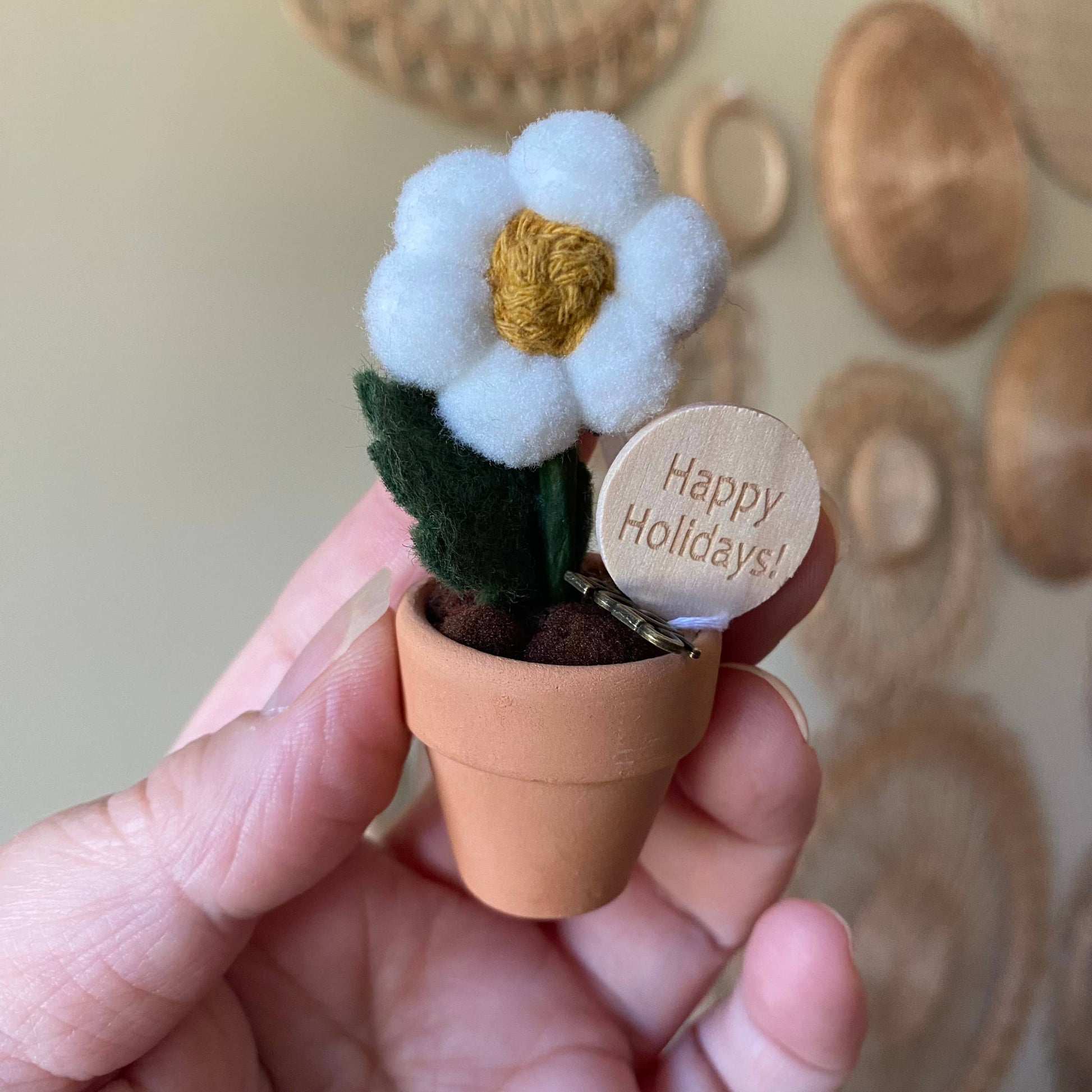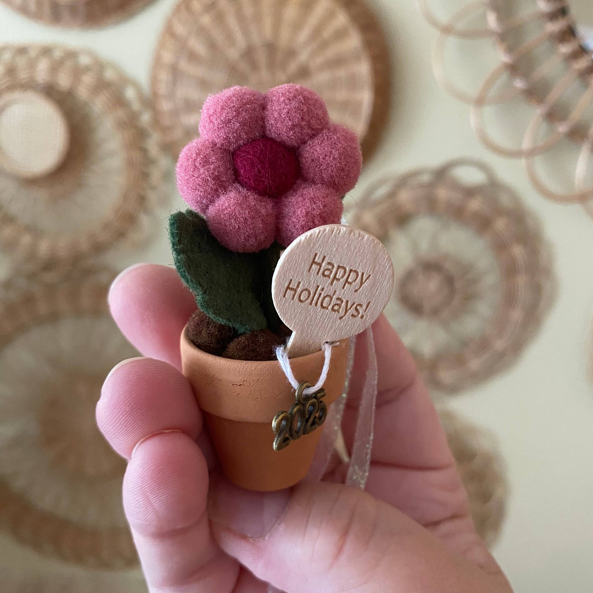Add a cozy, handmade touch to your holiday collection with this original fibre flower ornament. The included wooden tag (“Happy Holidays!”) and 2025 metal charm are fully removable for year-round display.