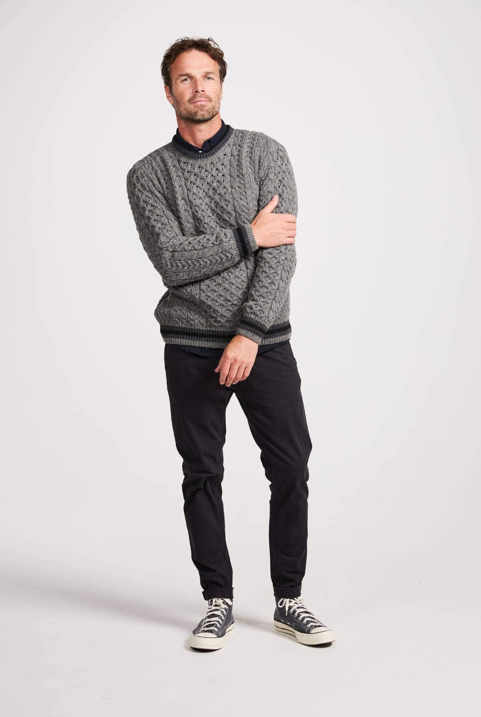 Here at Aran Woollen Mills, we’re eager to find new ways to honour the Aran tradition while simultaneously helping it find its place in the modern wardrobe. The Inishbeg Stripe Men’s Crew Neck Sweater does just that.