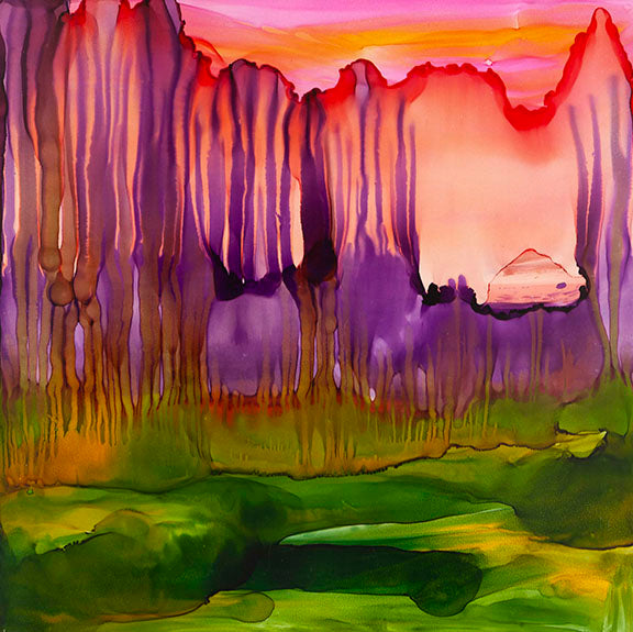 Tall vertical streaks of purples, reds, and oranges rise from the mid-ground, resembling elongated trees or melting canyon walls. The colors blend and bleed into one another, giving the scene a sense of motion and softness. Above, the sky glows with warm gradients of golden pink, peach, and yellow, as if capturing a surreal sunset. Below, luscious rich greens and yellows spread across the foreground like rolling fields or mossy terrain. The entire composition has a luminous, ink-flow quality, with organic shapes and drips that evoke nature while remaining intentionally abstract and expressive.
