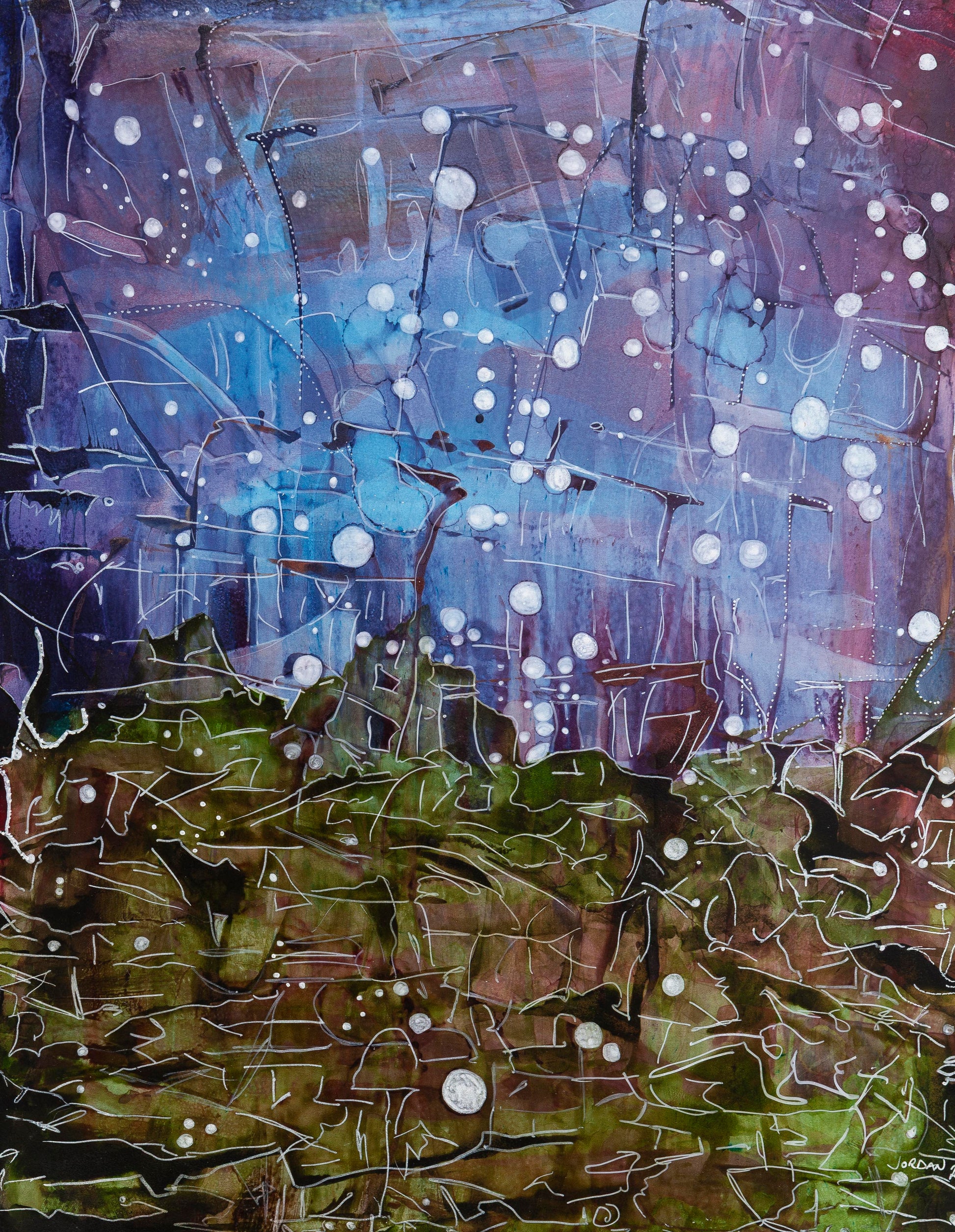 Scattered throughout are Jordan’s signature style dots and dotted trails, connecting all of us in the world on our separate life journeys. These luminous stars give the piece a feeling of expansion and quiet wonder.