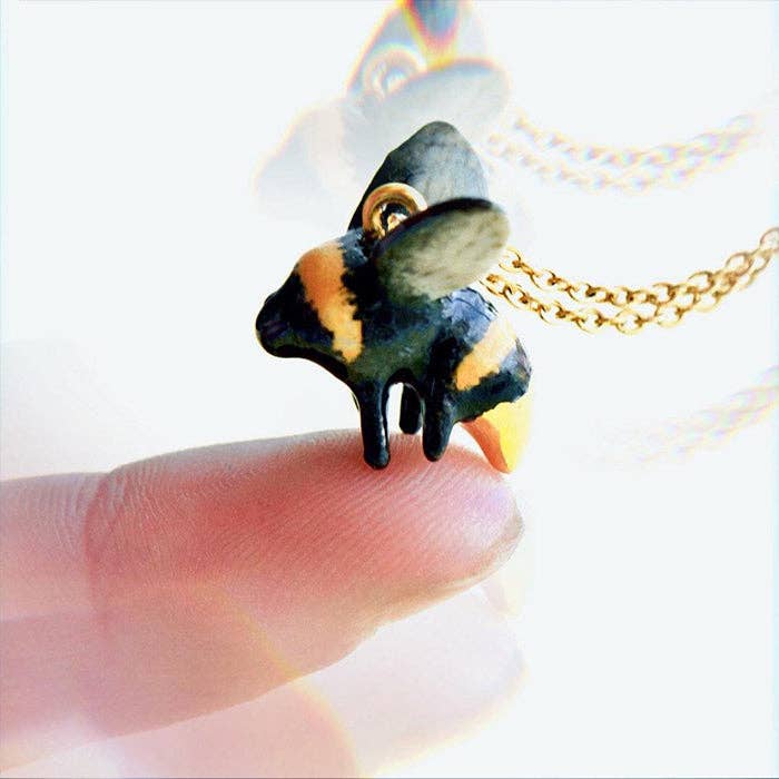 Embrace the spirit of spring with Camp Hollow's Midas Bee Necklace! This porcelain pendant features a bumbling bee with delicate wings and a golden sting, making it a buzz-worthy addition to any outfit. Strung on a genuine gold chain, it's a piece fit for the queen of any hive. Due to the handmade nature of this product, slight variations in color and design may occur, making each piece truly one-of-a-kind. Perfect for nature lovers, garden enthusiasts, or anyone who appreciates intricate, handcrafted jewelry.