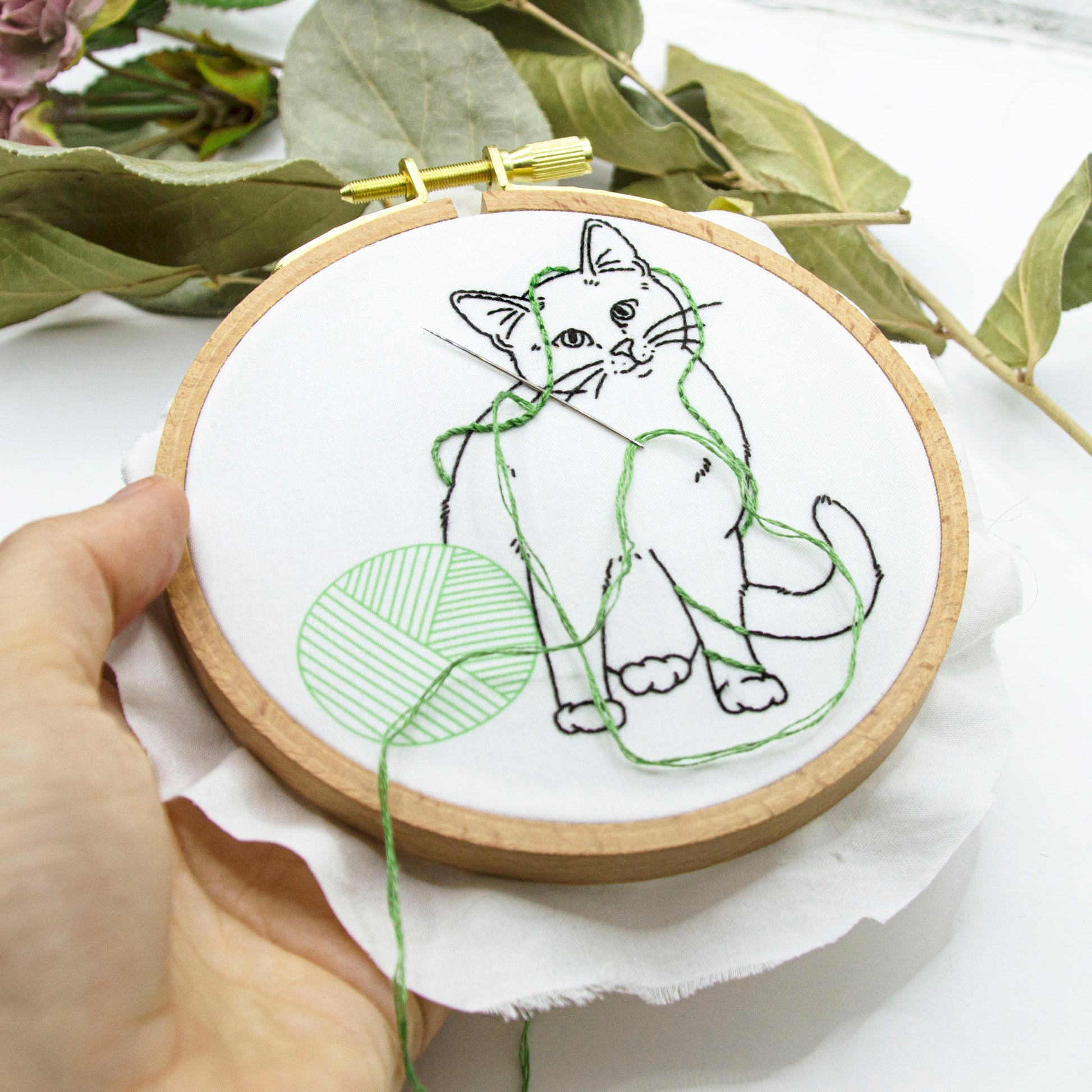 Come spend a cozy evening at Two Macaws learning the art of hand embroidery — and create your very own mischievous little feline caught in a ball of yarn!