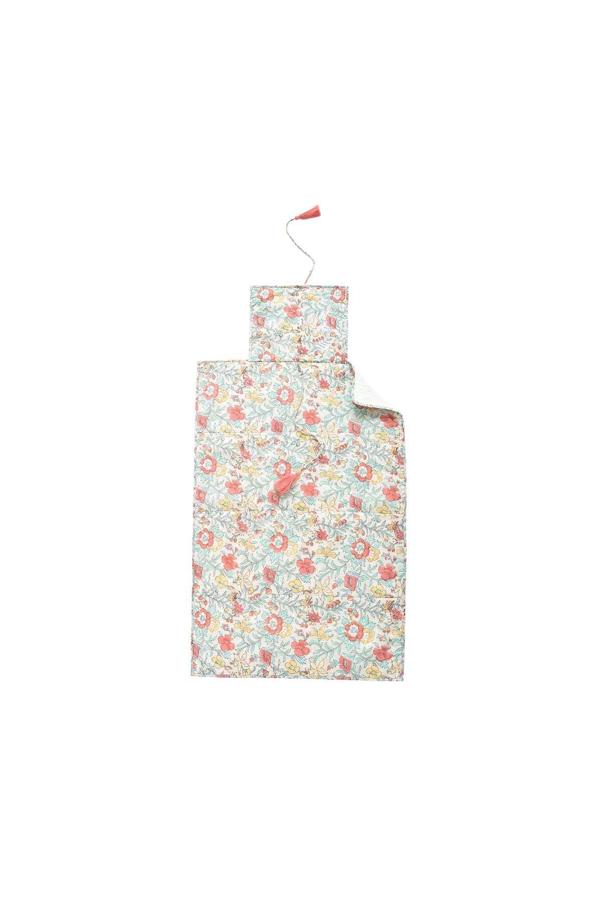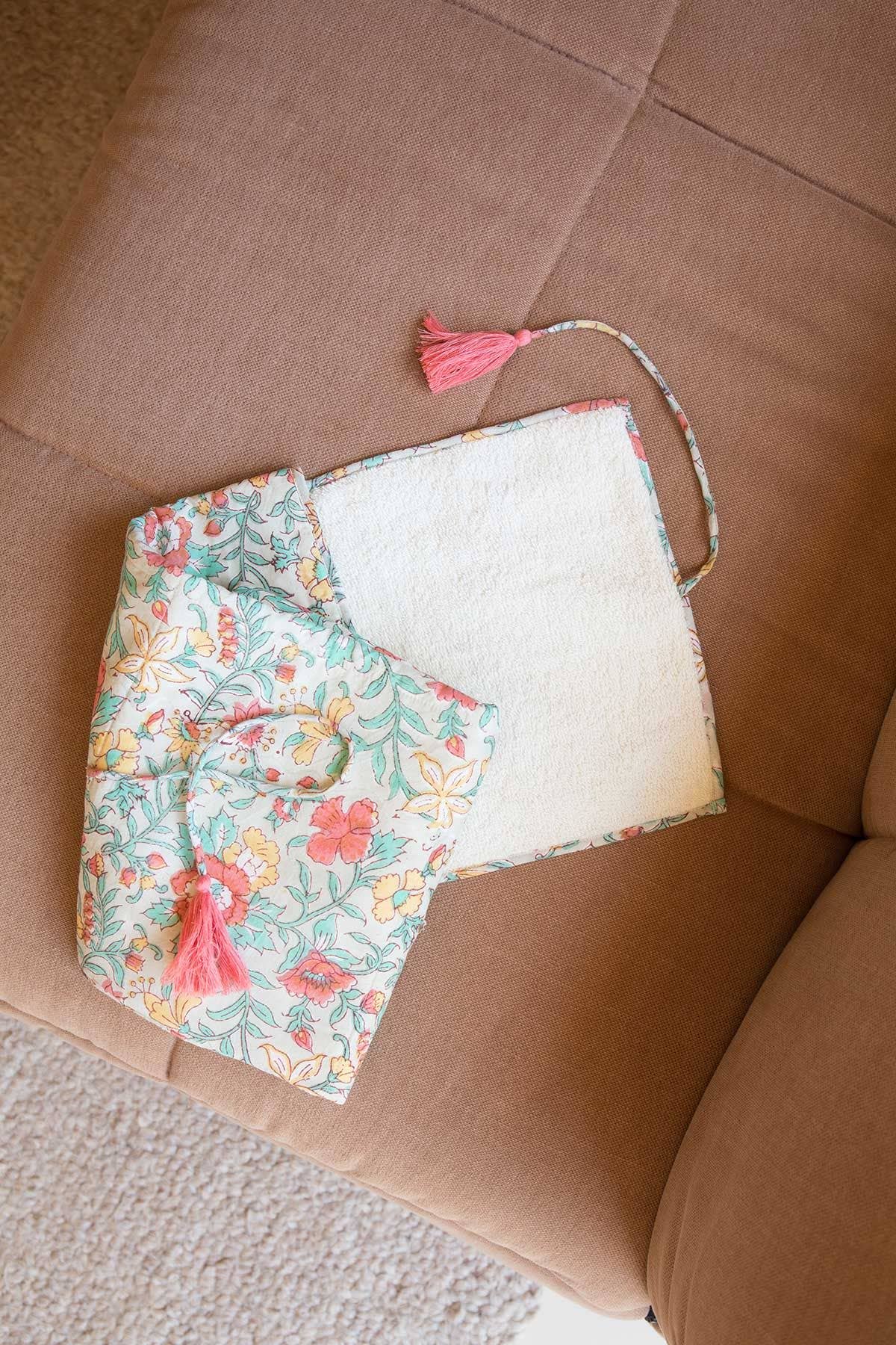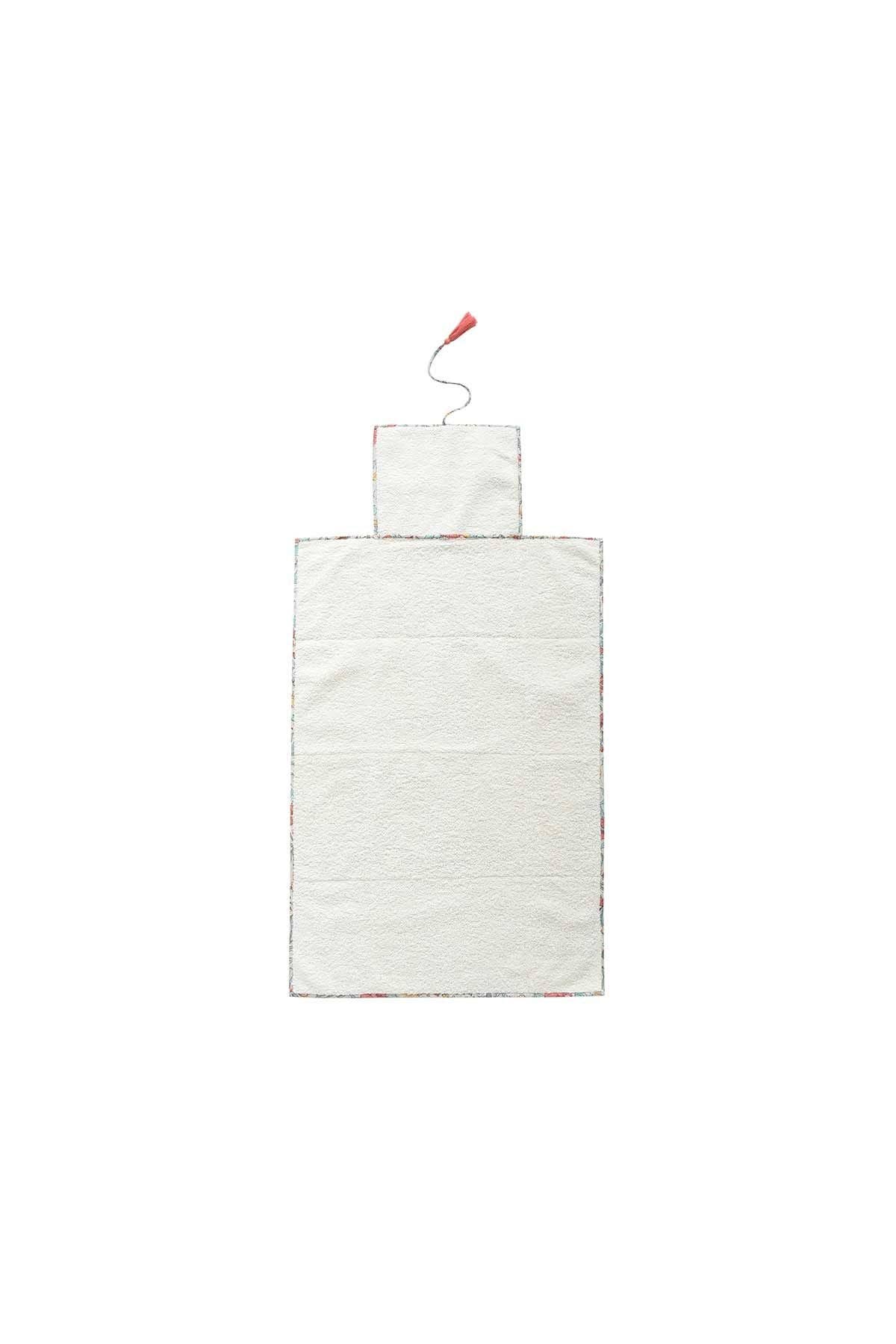 Love of detail: * Travel changing mat. * Padded and quilted with wadding. * Tie closure. * Handmade colorful pom-poms. * Plain interior in waterproof fabric. This piece was designed by Marie Pidancet and her passionate team.