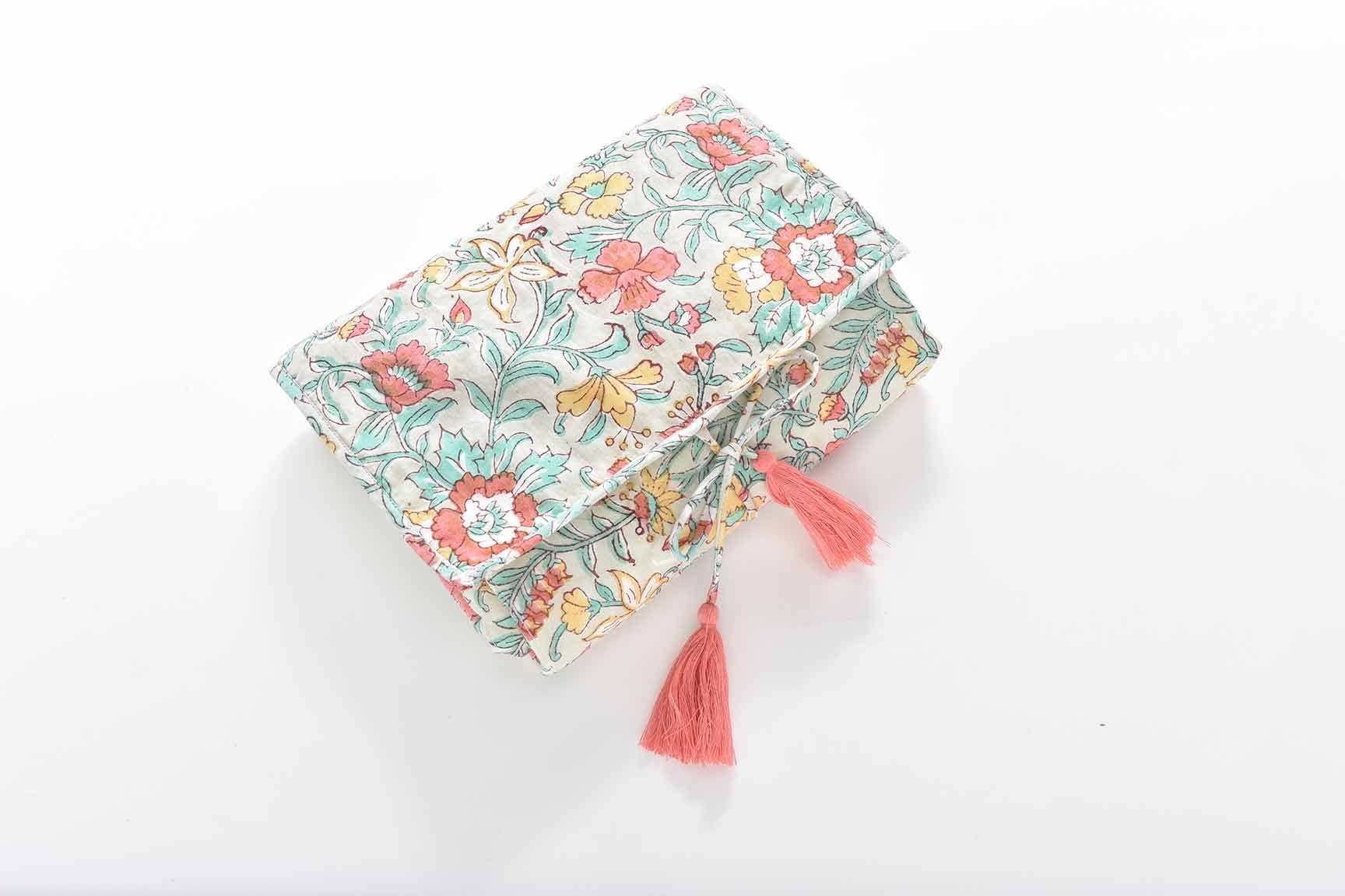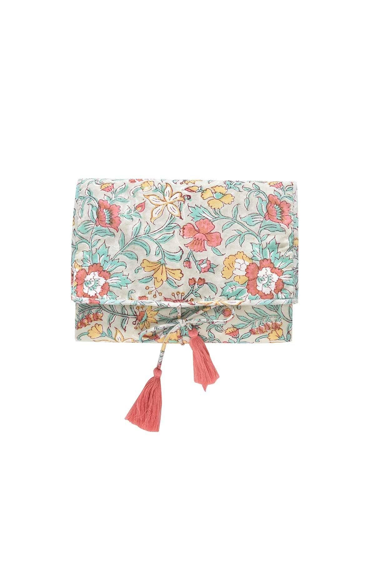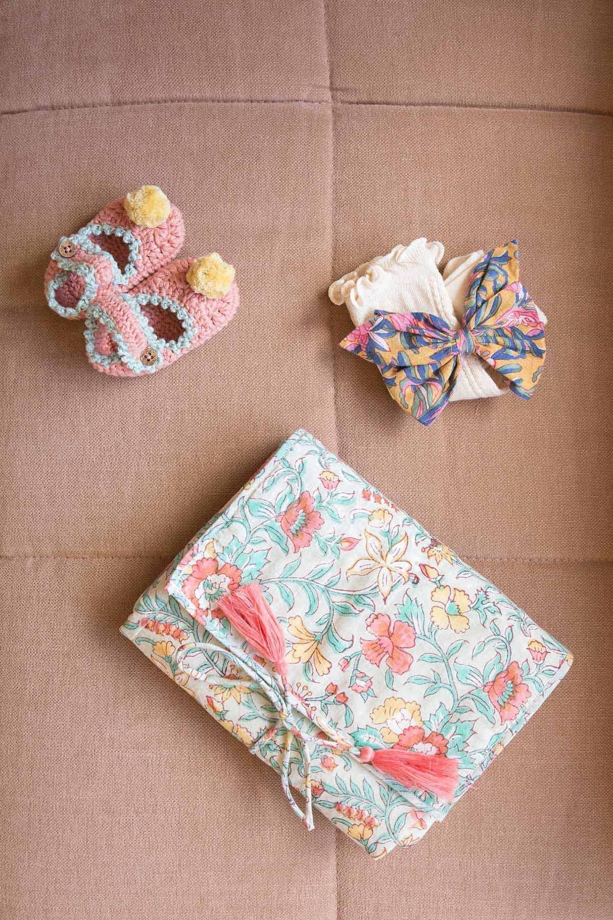Love of detail: * Travel changing mat. * Padded and quilted with wadding. * Tie closure. * Handmade colorful pom-poms. * Plain interior in waterproof fabric. This piece was designed by Marie Pidancet and her passionate team.
