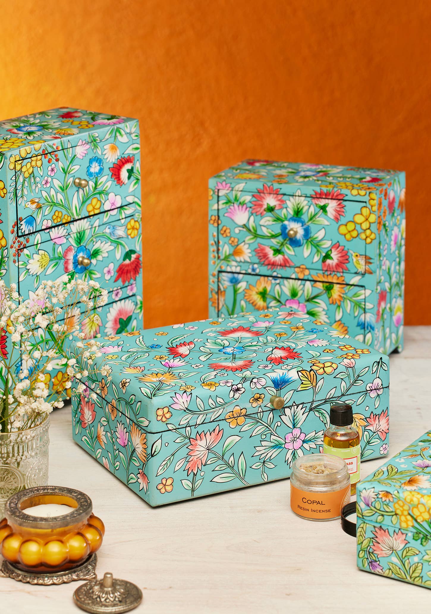 The Saanvi hand crafted large wooden box is a sustainable gift of beauty. Hand painted in a bright mixed floral pattern on a pale blue background, the hinged lid is fitted with a small gold coloured knob. The midnight interior provides a practical storage solution for trinkets, jewellery and keepsakes.