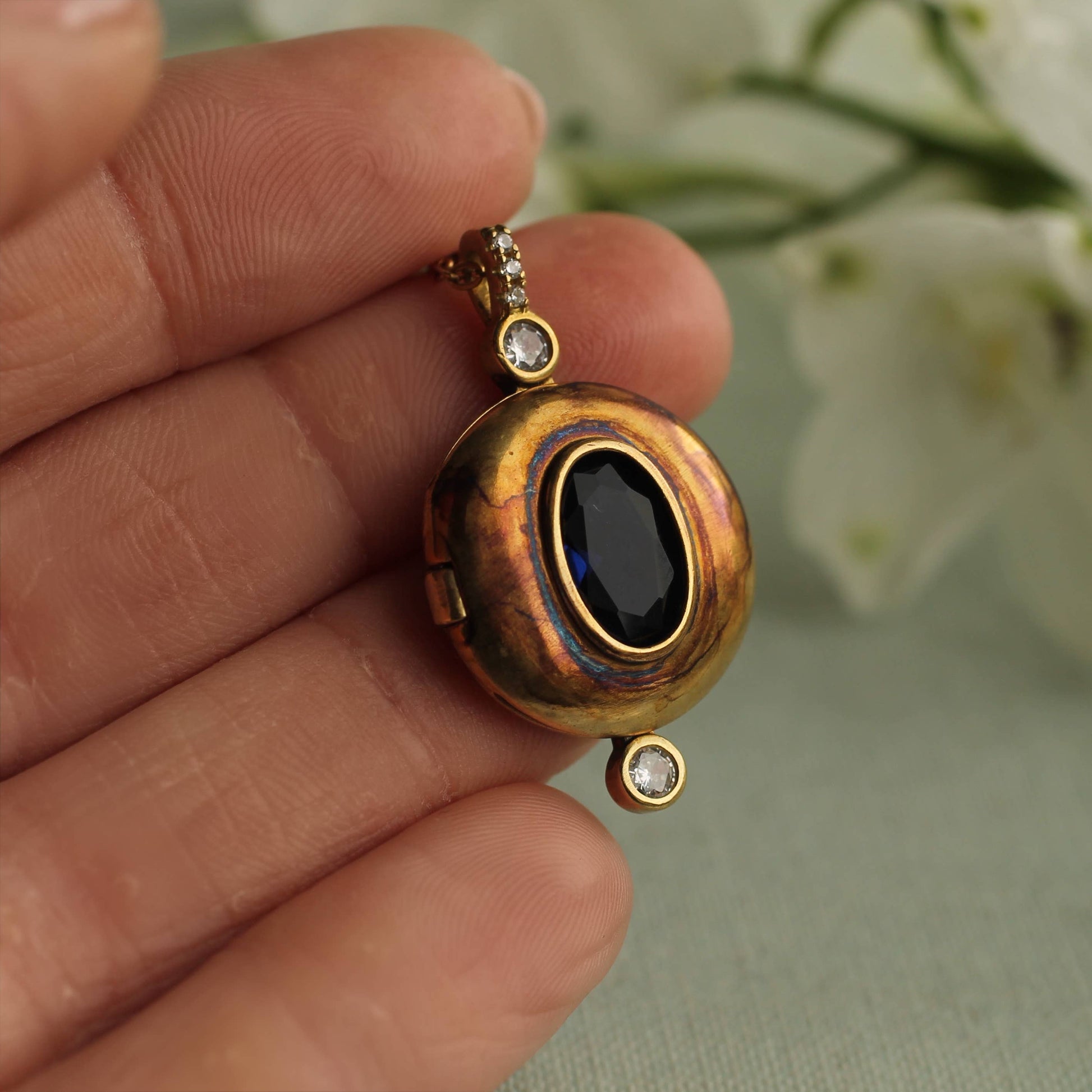 This beautiful, Art Deco personalized locket necklace features a deep navy sapphire glass jewel set into the centre, with two tiny accent crystals above and below. The solid brass has a beautiful, antique patina with an incredible iridescence when it catches the light. The locket measures 30mm long in total. The central, round part of the locket is 20mm in diameter.]