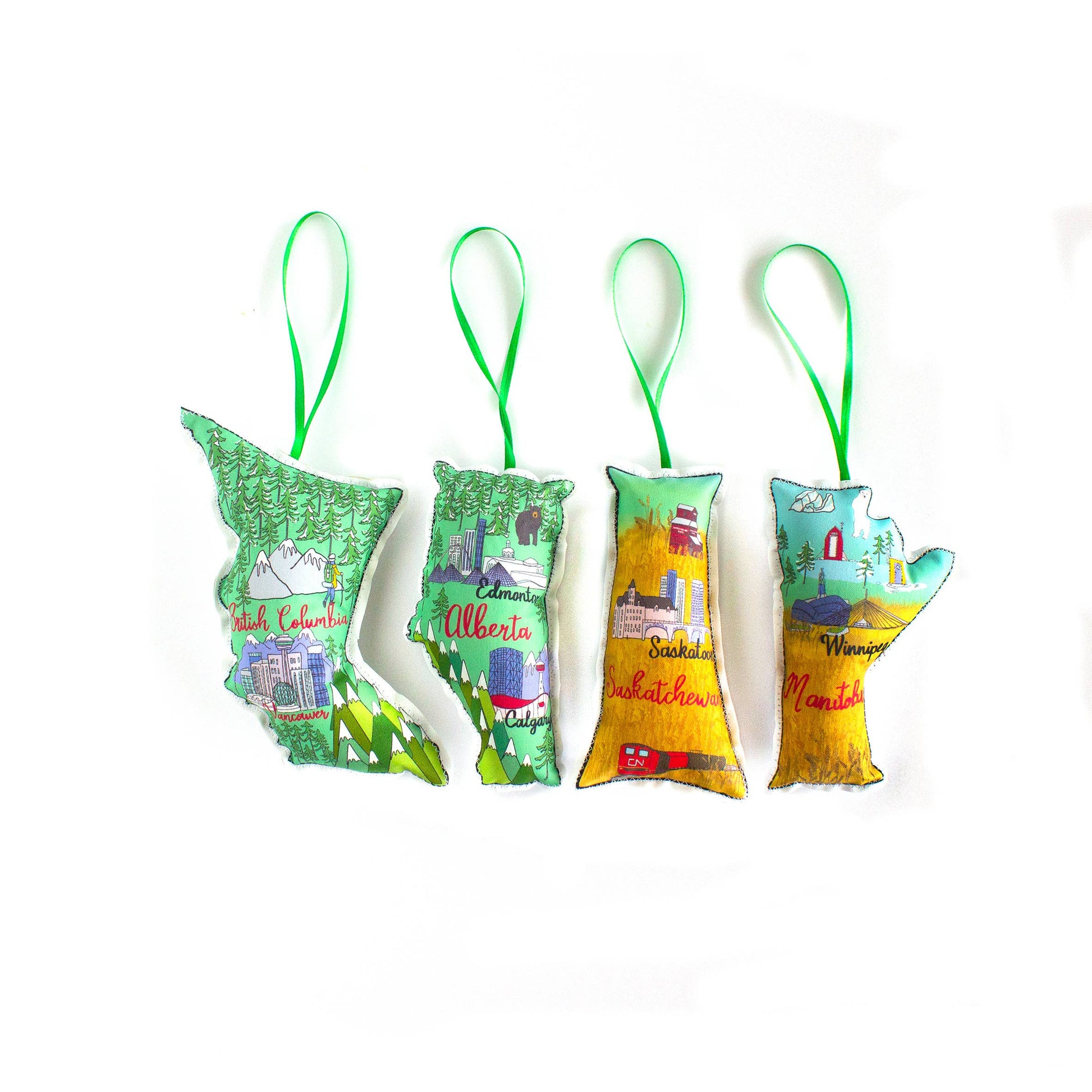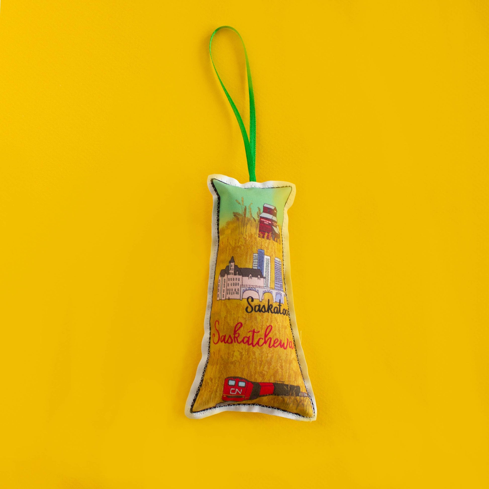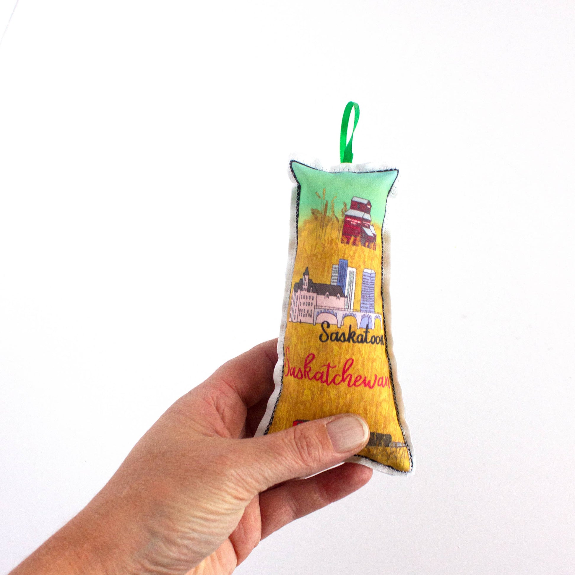 Add some fun and charm to your Christmas tree with this adorable Saskatchewan map. Featuring an illustrated print of Canada's prairies city's and icons map.