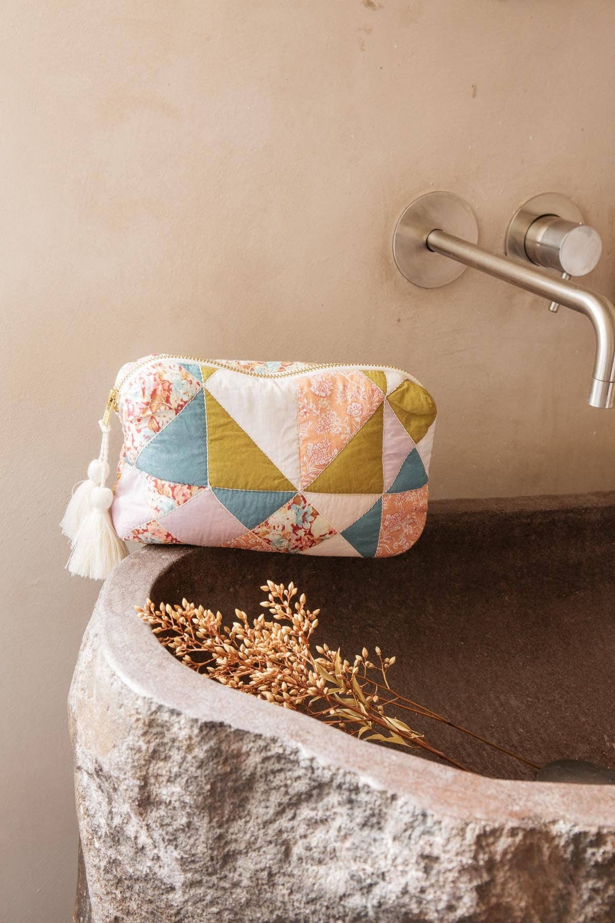 Iconic from Louise Misha and delightfully useful, this quilted and tasseled pouch brings a bohemian touch to our daily lives. To give or to treat yourself, it will always find its place in your luggage. Love of detail: * Quilted pouch. * One side patchwork, one side floral print all-over. * Golden zip opening. * Hand-made colorful tassel. * Plain non-water-repellent lining.