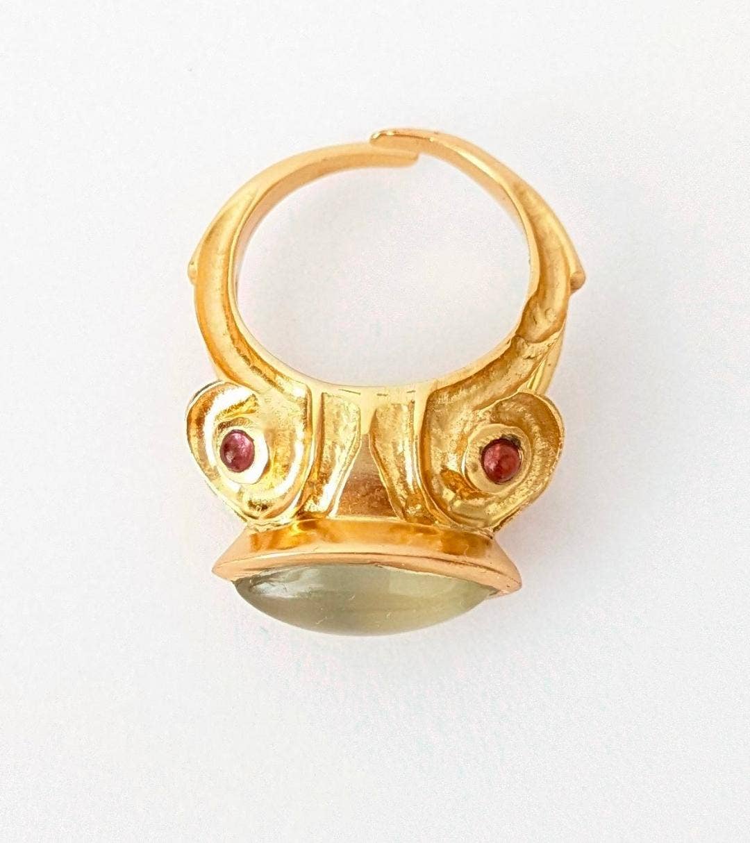 "JEWELRY FOR DIFFERENT WOMEN" Ottoman-inspired ring, with a majestic design that evokes the richness of ancient goldsmithing. In the center, a beautiful prehnite brings an ethereal and comfortable air, enhanced by two delicate pink tourmalines that add a subtle touch of color and elegance. A unique piece of jewelry that combines history and distinction.